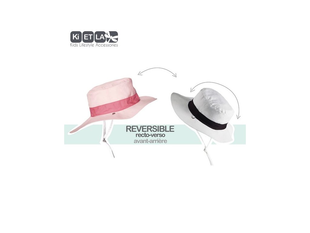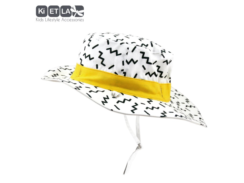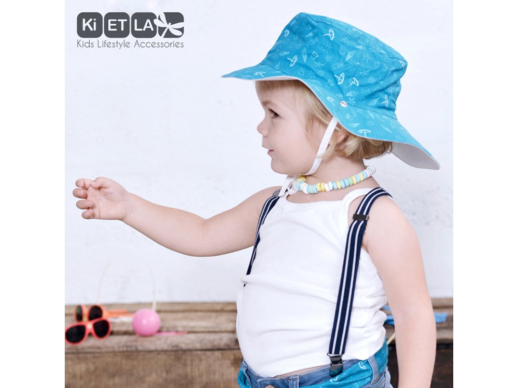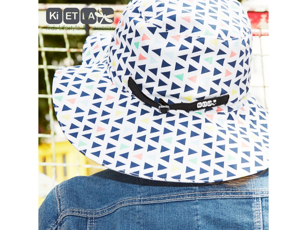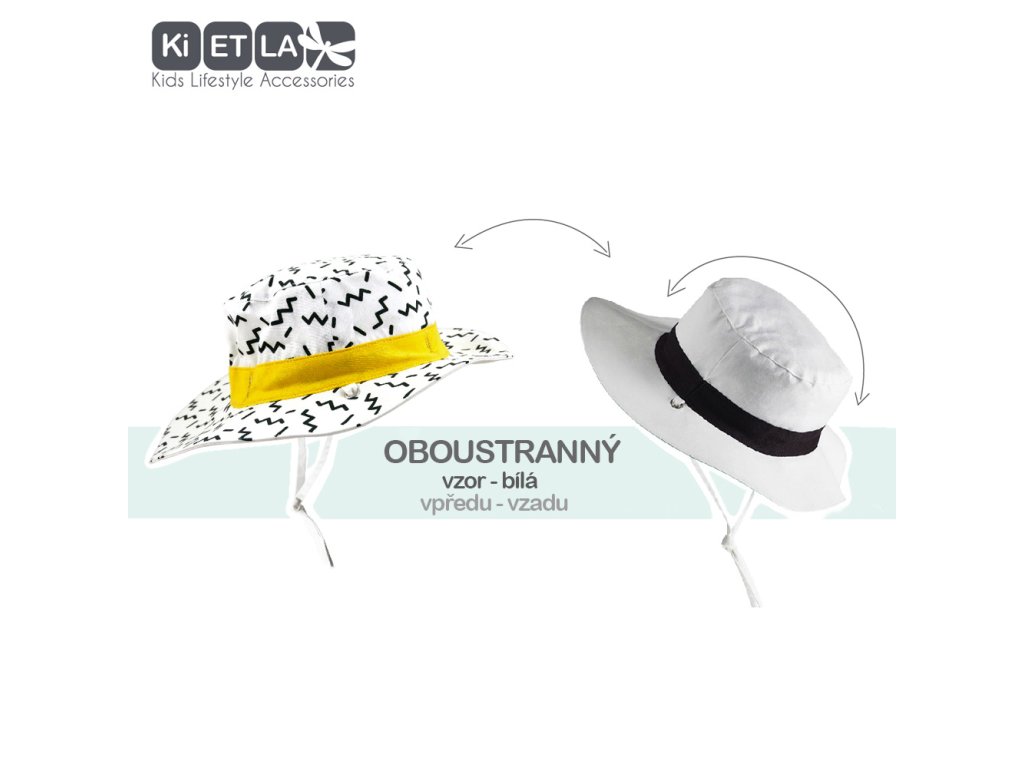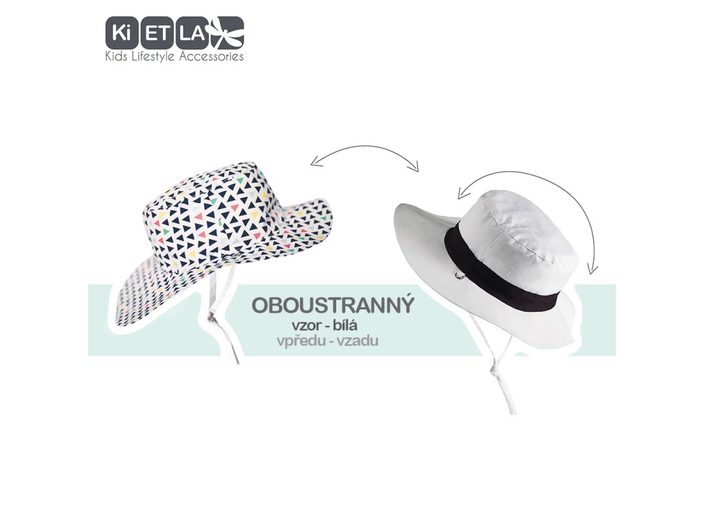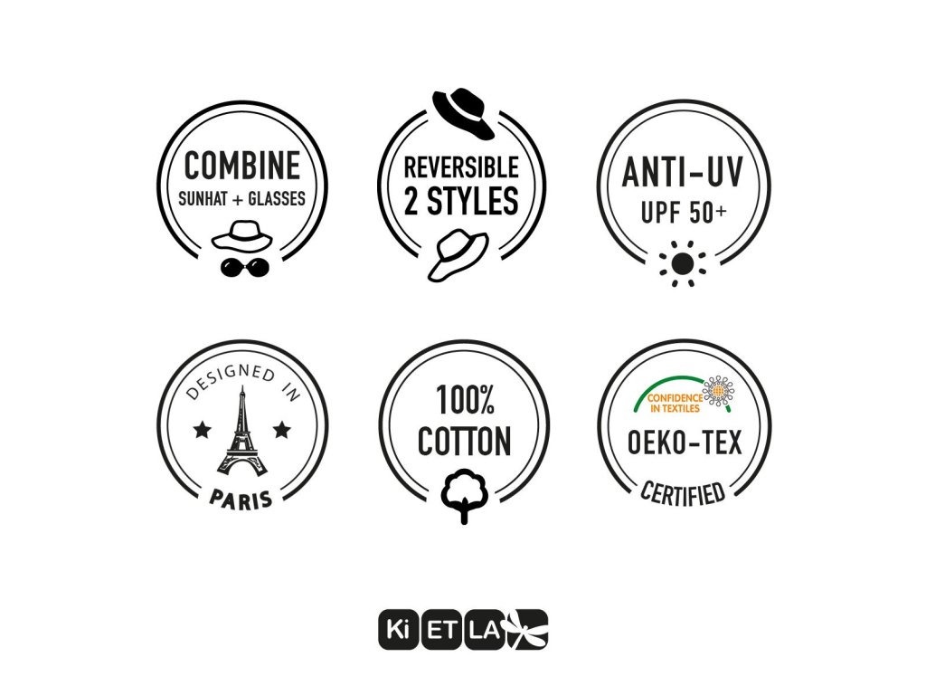Kloboučky KiETLA jsou vyrobeny z příjemné 100% bavlny s Oeko-Tex® certifikátem, který zaručuje, že výrobek neobsahuje žádné látky škodlivé pro malé děti a životní prostředí. UV ochrana s UPF indexem více než 50 (UPF 50+) blokuje až 97% UVB a 95% UVA paprsků. Oboustranné provedení - z jedné strany barevný vzor a z druhé strany neutrální bílá s černým páskem. Jedna strana stříšky je širší a otočením klobouku dle potřeby více zastíníte buď obličej nebo krk dítěte.