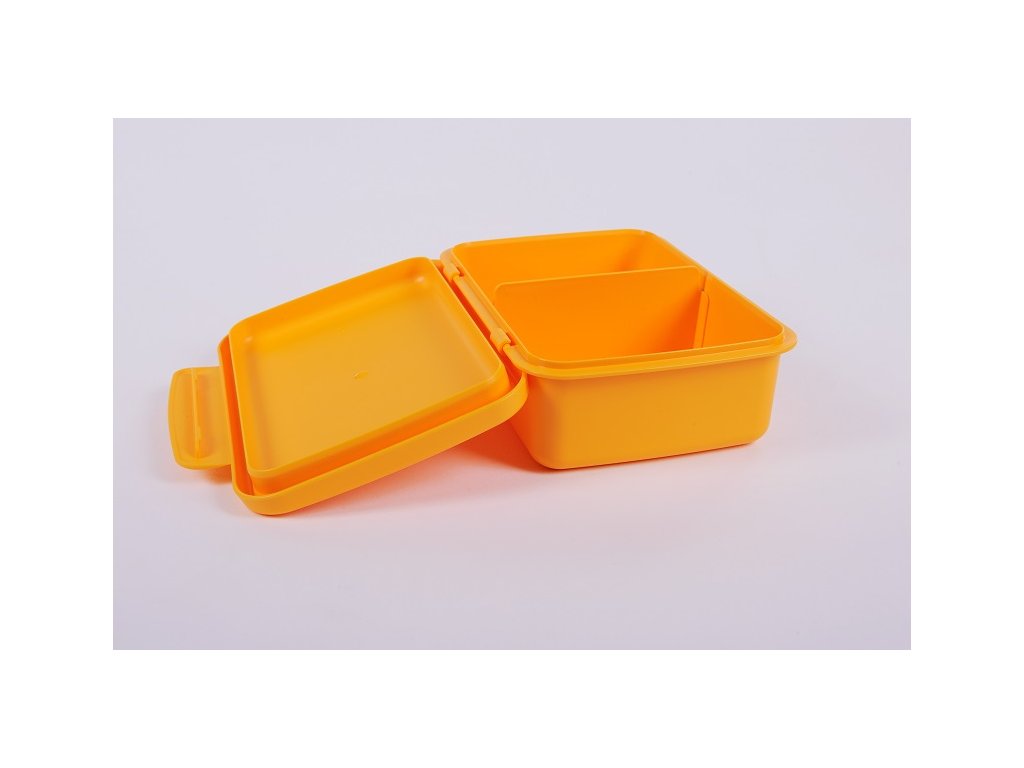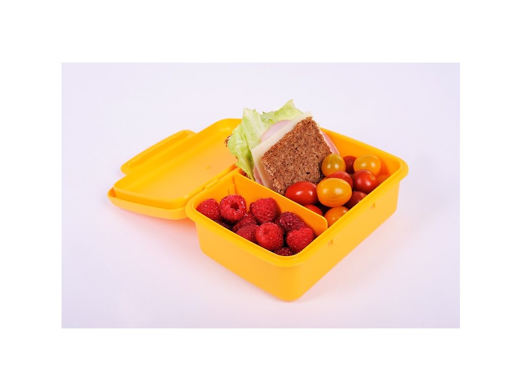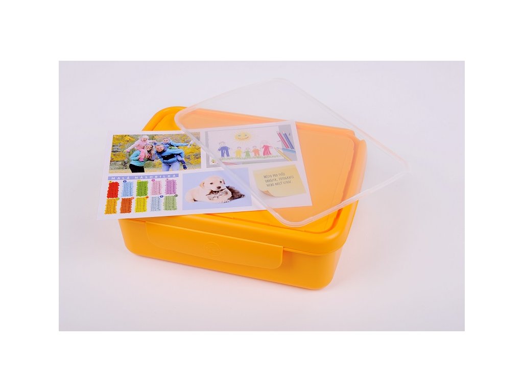 Druhou součástí setu je box na svačinu. Na víčku najdete průhlednou skrýš, kam můžete vložit fotografii, rozvrh hodin nebo tahák. Box snadno rozdělíte na dvě části díky odnímatelné přepážce. Jednu využijete třeba na housku, druhou na ovoce. Svačina se tak nepromíchá a bude vždy vypadat skvěle. A když dorazí dítko domů, strčíte box do myčky, aby byl zase připraven k akci.