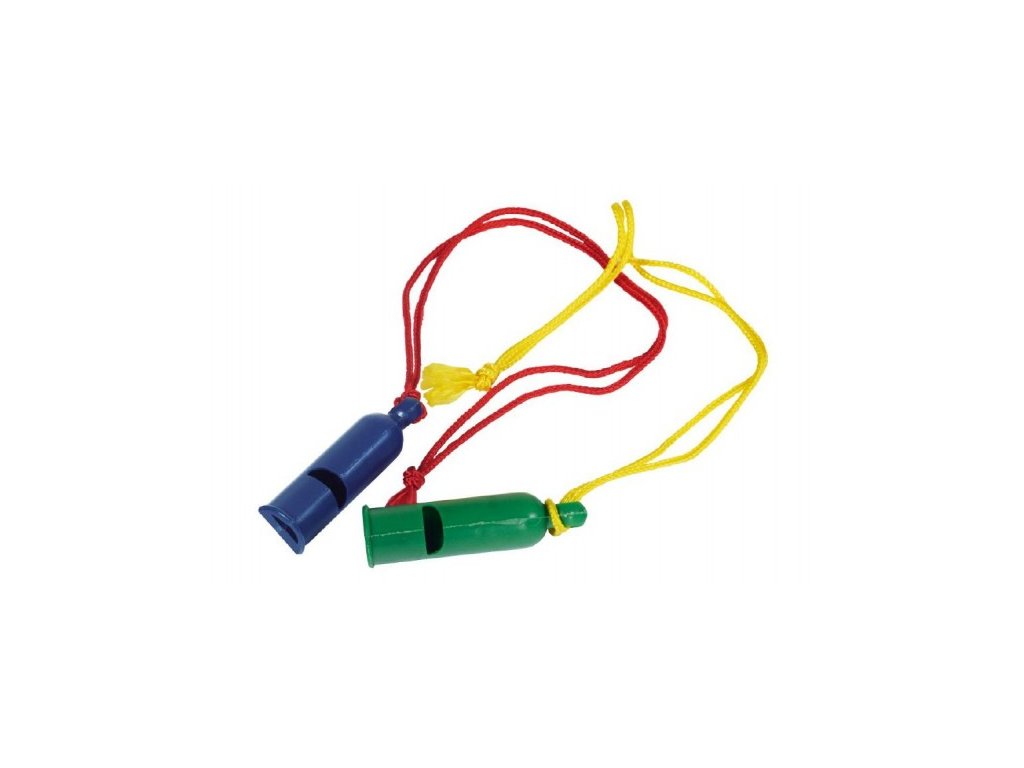 Dětská plastová signální píšťalka s krátkou šňůrkou na zavěšení třeba na batoh.