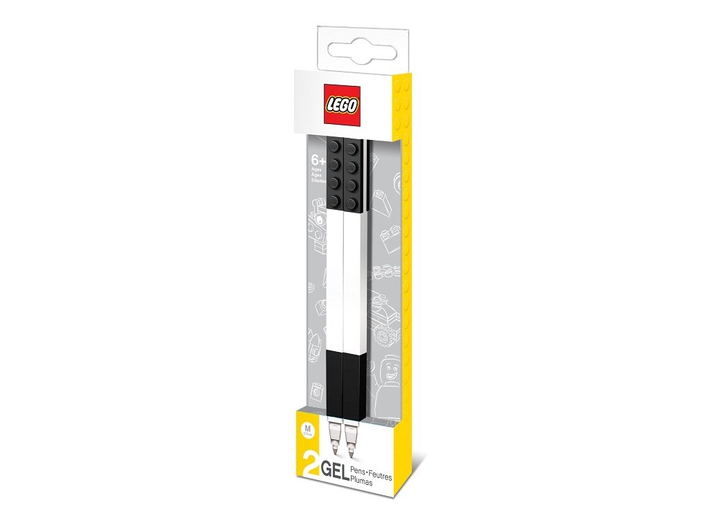 Dvojice černých LEGO gelových per. Součástí pera jsou 2 proužky LEGO destičky pro spojení např. s LEGO pouzdrem, minifigurkou, jiným perem nebo k nacvaknutí na LEGO pravítko.