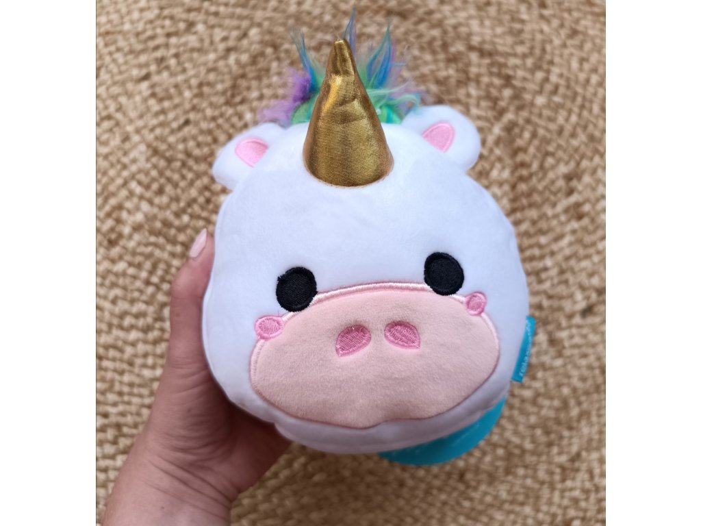 Roztomilý plyšový jednorožec, kulatý cestovní polštářek má více tváří. V zapnutém stavu je to praktický malý kulatý polštářek, po rozepnutí se polštářek prodlouží a navíc si lze nasadit masku na oči, proti rušivému světlu. Aby se polštářek nikdy neztratil, má praktickou sponu pro zavěšení na batoh či opasek.